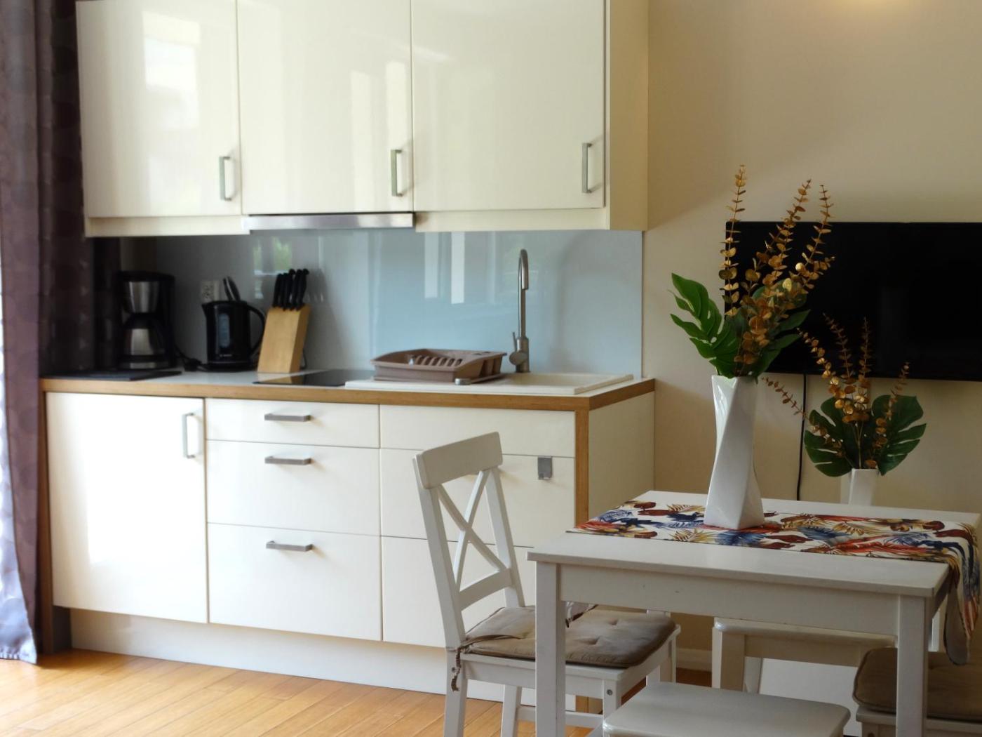 Apartament (4 osoby dorosłe). Boasting a private entrance, this suite also comes with 1 separate bedroom, 1 bathroom with a walk-in shower, a kitchen and a dining area. Meals can be prepared in the well-fitted kitchen, which features a stovetop, a refrigerator and kitchenware. Featuring a balcony with garden views, this suite also features a tea and coffee maker and a flat-screen TV. The unit has 2 beds. Apartament typu Suite - 4 osobowy. Powierzchnia pokoju ok.: 27 mkw. ;